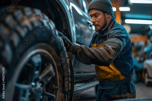 mechanic, tire, suv, workshop, repair, vehicle, automotive, maintenance, technician, tool, service, daylight, garage, industry, inspection, skill, equipment, safety, performance, wheel, craftsmanship, labor, professional, center, client, dirt, floor, machinery, teamwork, technology, metal, precision, workwear, auto