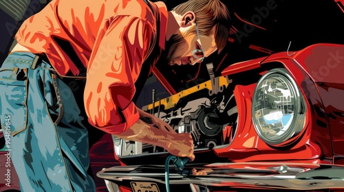mechanic, car, red car, classic car, vintage car, muscle car, engine, hood, working, tool, man, repair, maintenance, auto, automobile, automotive, service, garage, vintage, classic, retro, hot rod, restoration, hobby, bricolage, project, repairing, fixing, headlamp, chrome, detail, professional