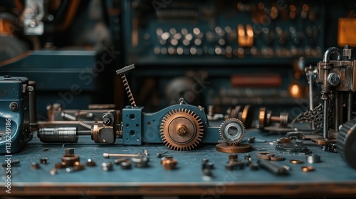 mechanical workspace filled with vintage and modern machinery parts