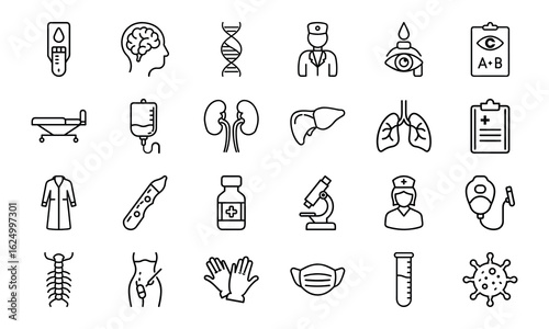 Medical and Healthcare Line Icon Set – Hospital Tools, Doctor Symbols, Human Organs, Virus, Mask, Injection, and Test Equipment Vectors
