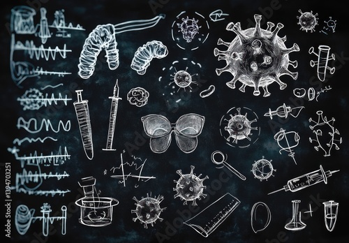 Medical and Scientific Sketches of COVID-19 Symbols, Vaccine, Lungs, and Healthcare Tools in Chalkboard Art Style
