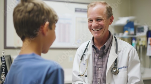 Medical Check-Up: Illustrate the importance of regular check-ups as a Caucasian doctor smiles warmly while providing thorough care to a young patient in a clinic or hospital setting.