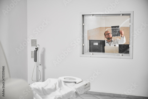 Medical computed tomography or MRI scanner. Doctor sitting at computer, examining MRI results. Male specialist wearing glasses and uniform, holding scan, studying. Concept of medicine and hospital.