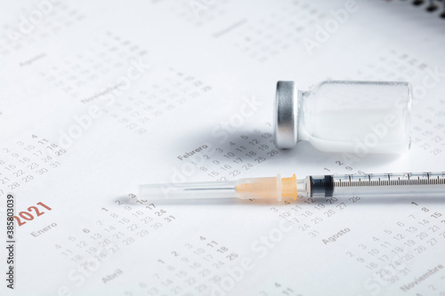 Medical concept. In the 2021 calendar, (names of months in Spanish, January, February, April, August, November) syringe with container of epidemic vaccine.