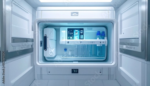 cooler, medicals, temperature, storage, transport, firefly, refrigeration, vaccine, sample, laboratory, inside, open, view, top, shelf, bottle, ampoule, science, research, pharmaceutical, medicine, health care, equipment, device, cold, unit, digital, screen, display, touch, interface, white, blue, light, clean, precise, controlled, environment, isolate, protection, sterile, compartment, analysis, technology, modern, closeup, insulation, indoor, natural