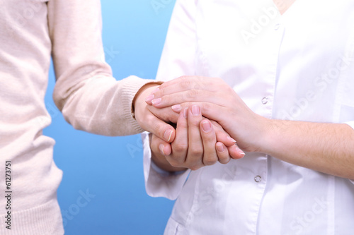 Medical doctor holding hand of patient, on light background