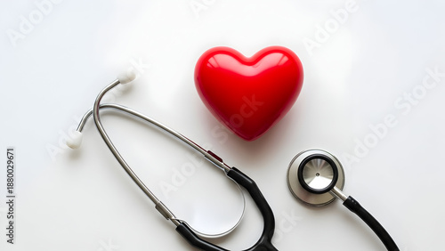 Medical equipment for heart health checkup with stethoscope and red heart on white background