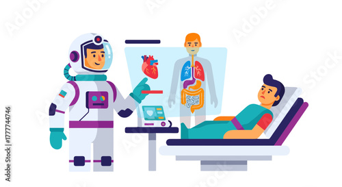 Medical Examination Illustration with Astronaut Doctor Analyzing Human Anatomy and Patient