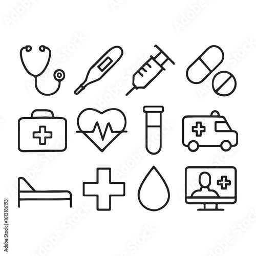 hospital, medicine, nurse, patient, stethoscope, ambulance, blood, doctor, outline, illustration, pill, symbol, vector, thin, analysing, appointment, cardiologist, clinical, concept, consultation, datum, diabetes, folder, health care, horizontal, disease, insurance, lifestyle, no people, obesity, prescription, record, simplicity, surgery, test, us, van, emergency, file, glove, health, check-up, mental health, pictogram, protection, shield, tomography, bed