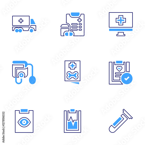 Medical icon set. Bold line style. Duotone colors. Editable stroke. delivery, tonometer, online pharmacy, eye exam, health check, blood test, medical report, medical prescription, medical