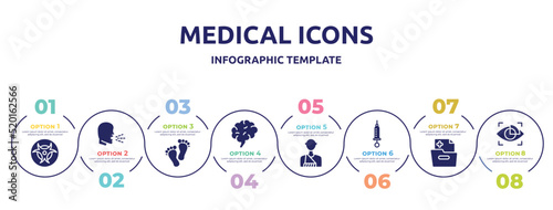medical icons concept infographic design template. included toxic, unhealthy medical condition, human feet shape, human brain, man with broken arm, syringe with medicine, medical results folders,