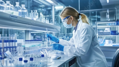 Medical laboratory with modern equipment, scientist analyzing sample.