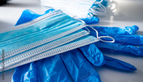 Medical mask and blue gloves on white table. Surgical mask and gloves. Virus protection concept. Healthcare and medical equipment in the hospital. Antiviral medical protection against corona virus.