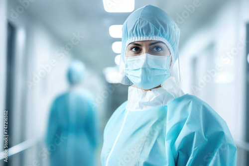 hospital, medicals, staff, professional, female, protective, gear, scrub, surgical, cap, mask, health care, men at work, doctor, nurse, corridor, confident, standing, safety, uniform, hygiene, gown, equipment, clinic, sterile, environment, indoor, service, expertise, occupation, practitioner, personnel, medicine, career, dedication, assistance, clean, health, wellness, blue, portrait, focused, readiness, preparation, preparedness, authority, provider, ai