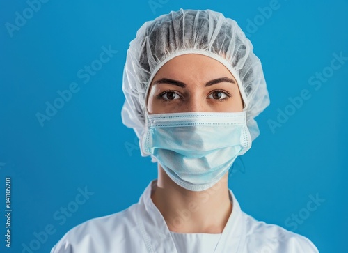 Medical professional wearing surgical mask for protection in blue background studio portrait shot
