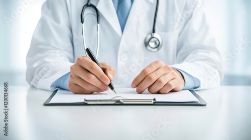 Medical Professional Writing Notes in a Clinic Environment with Stethoscope and Medical Papers on a Table, Focusing on Healthcare and Patient Care