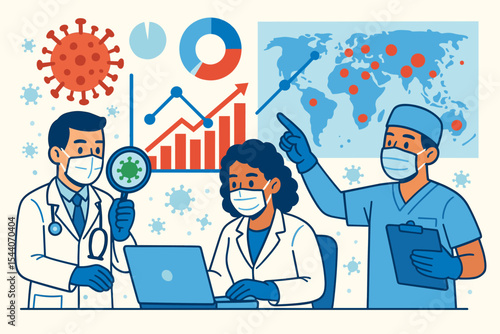 pandemic, medicals, doctor, health care, outbreak, datum, analysis, statistic, global, virus, infection, chart, graph, teamwork, research, scientist, nurse, hospital, disease, epidemic, laboratory, prevention, protection, mask, map, widener, surveillance, vaccine, team, laptop, report, medicine, diagnosis, public health, clinical, illustration, infographic, monitoring, emergency, crisis, quarantine, investigation, vector, cartoon