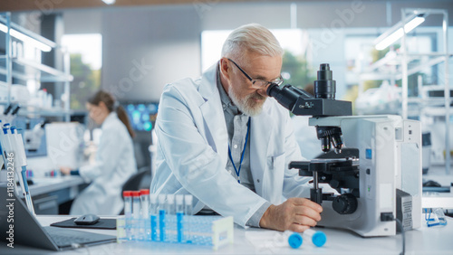 Medical Research and Development Laboratory: Senior Caucasian Male Scientist in Glasses Looking at a Sample in a Petri Dish Under a Microscope in an Advanced Biotechnology Lab