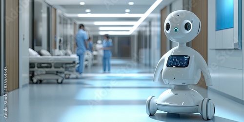 robot, health care, hospital, medicals, technology, future, futuristic, ai, artificial, intelligence, machine, automation, assistance, care, patient, nurse, doctor, room, corridor, hallway, floor, white, clean, sterile, modern, advanced, digital, screen, monitor, nubes