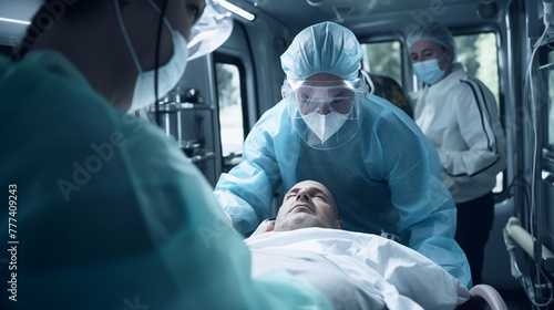 Medical staff providing patient care during transport in an emergency vehicle, ensuring safety and urgent medical attention throughout the journey.