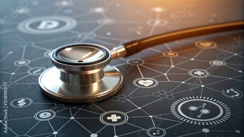 Medical stethoscope on a digital network background symbolizing healthcare technology and innovation.