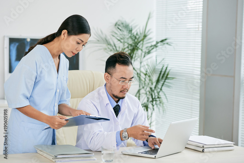 asian, vietnamese, medicine, doctor, consulting, team, hospital, clinic, professional, co-worker, health care, intern, physician, practitioner, history, document, nurse, colleague, working, occupation, laptop, screen, information, analysing, workplace