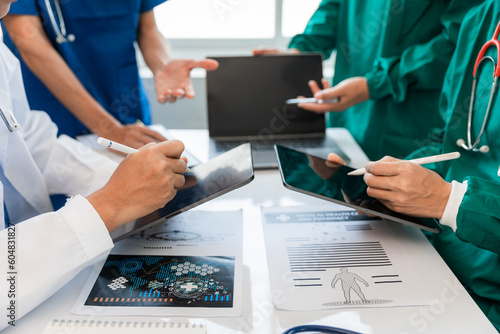 Medical team meeting with doctors in white lab coats and surgical gowns sitting at table discussing patient history. success of medical health care The concept of working with a doctor. Close up.