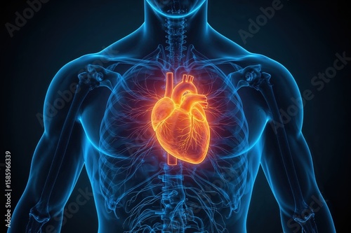 Medical visualization of human heart with glowing effect inside transparent chest cavity for healthcare marketing and educational content creation