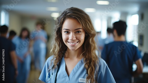 Medical woman student standing in hospital with group mates background.