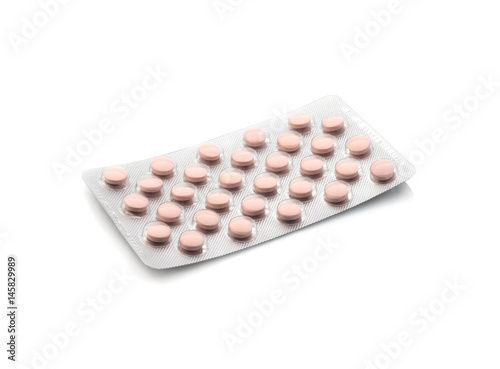 Medicinal pink pills with expired shelf life on a white background. Isolated