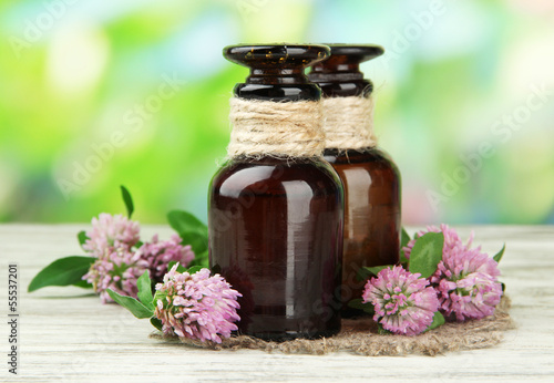 Medicine bottles with clover flowers on wooden table, outdoors