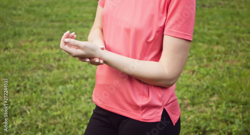 female, woman, checking, measuring, pulse, hand, cardio, human, person, wrist, nubes, health, blood, care, medicals, pressure, check, take, physical exercise, activity, closeup, girl, sick, lifestyle, rate, high, test, beat, cardiac, disease, fit, hand, ill, self, suffering, unwell, adult, 1, sport, woman, young, arm, caucasian, cheerful, concept, doctor, t-shirt, wear