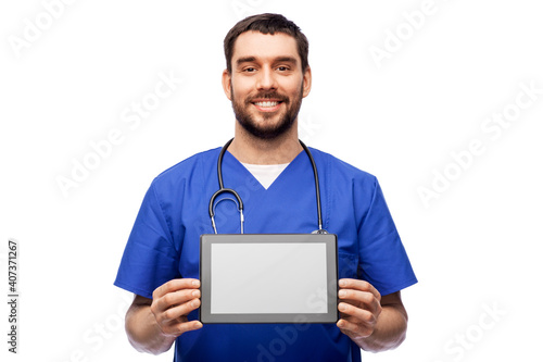 medicine, healthcare and technology concept - happy smiling doctor or male nurse in blue uniform with stethoscope showing tablet pc computer over white background