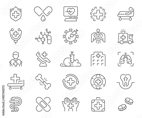 medicine, flat, medical equipment, linear, outline, vector, icon, set, hospital, pharmacy, emergency, treatment, health, doctor, nurse, prescription, health insurance, clinic, surgery, diagnosis, make well, prevention, pharmaceutical, wellness