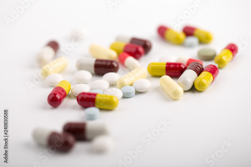 Medicine pills, tablets and capsules over white background