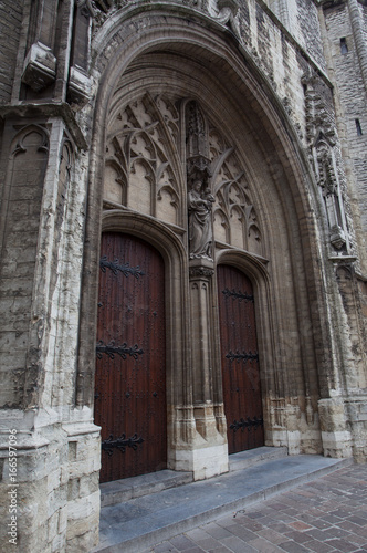 Medieval architecture style of door at St. Bavo's Cathedral in Ghent Belgium