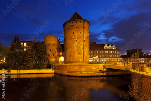 Medieval city tower and walls of Gdansk, Poland at sunset
