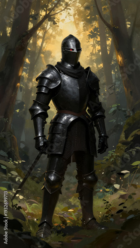 knight, armoring, mediaeval, forest, warrior, sword, fantasy, illustration, artwork, battle, helmet, nature, adventure, hero, dark, light, cinematic, dramatic, shadow, foliage, tree, standing, solitude, mystic, sunlight, filter, epic, realistic, detailed, render, enchanted forest