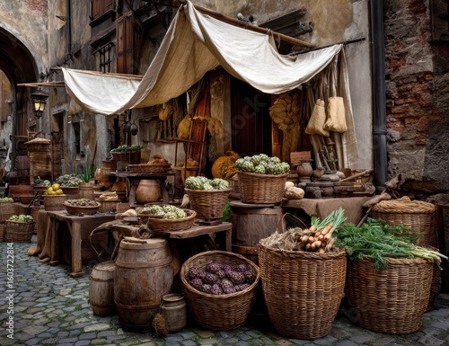 mediaeval, market, stall, alley, cobblestone, awning, basket, vegetable, fruit, herb, spice, wooden, container, rustic, brown, textile, ancient, good, display, seller, produce, trade, commerce, history, europa, italy, authentic, setting, shop, atmosphere, light, shadow, detail, texture, food, organic, dark, vintage, aged, craftsmanship, economy, historical, architecture, structure, scene, photo, still, daylight