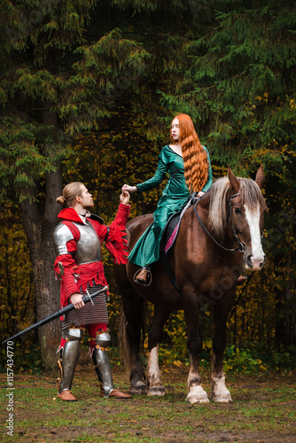 knight, horse, woman, horseback, mediaeval, redhead, red hair, armoring, red, green, dress, forest, autumn, holding hands, romance, fantasy, rider, long hair, historical, man, equestrian, chivalry, love, fairy tale, story, sensuality, warrior, nature, elegance, tradition, renaissance, legend, courage, enchantment, oneness, royalty, princess, prince, heritage, dramatic, fairy tale, bond, interaction, noble, strong, mystery, passion, sword, guard