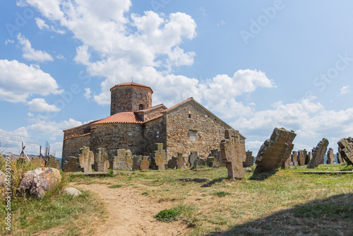 Medieval stone Serbian Orthodox church surrounded by ancient cemetery with weathered tombstones and cross markers creating atmospheric historical scene. Novi Pazar, Serbia.