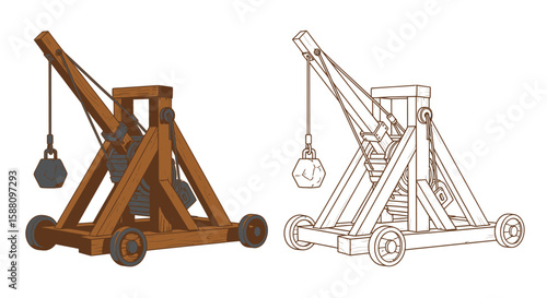Medieval Trebuchet Coloring Page with Detailed Colored and Outline Designs Siege Warfare