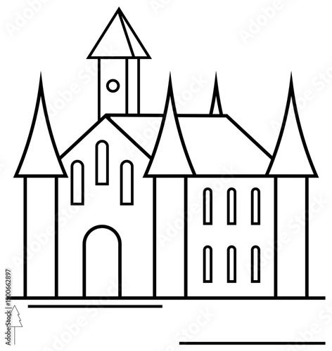 Medieval-style castle with symmetrical pointed towers, arched doors, and elongated windows. Ideal for heritage, architecture, fairy tales, history, exploration storytelling and fantasy. Flat simple