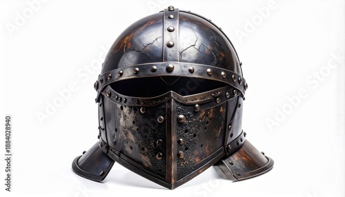 helmet, knight, mediaeval, metal, dark, cracked, ridge, visor, ventilation, hole, riveted, neck, guard, armoring, highlight, contrast, sharpened, structure, form, object, isolated, visual, element, composition, scene, realistic, background, neutral, minimalist, clean, organised, design, clarity, style, decorative, historical, craftsmanship, warrior, battle, protection, symbol, identity