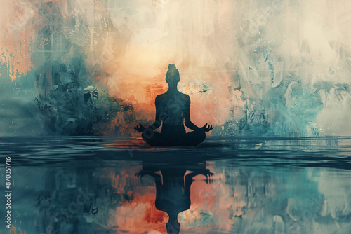 Meditation and mindfulness concept illustration, the silhouette of a person meditating in front of a serene background