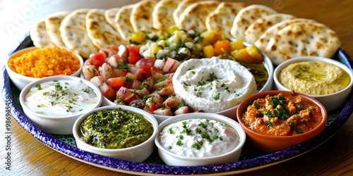food, dip, hummus, bread, pita, salad, tomatoes, cucumber, olive, cheese, dairy, parsley, mint, garlic, lemon, olive, oil, red, pepper, yellow, orange, green, white, brown, fresh, delicious, tasty, healthy, vegan, vegetarian, dinner, lunch, snack, party, catering, plate, tray, serving, table, eatery, cookery, meal, savoury, favor, homemade, traditional, receipe, ingredient