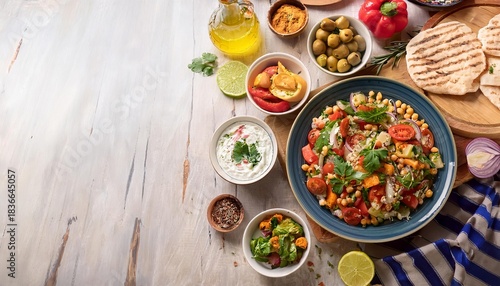mediterranean, food, table, salad, healthy eating, fresh, vegetarian, topview, vegan, hummus, chickpea, tomatoes, olive, olive oil, dip, yogurt, overhead, full frame, dinner, lunch