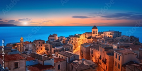 mediterranean landscape with ocean and sunset sky, beautiful island with a ancient village, fictional landscape created with generative ai