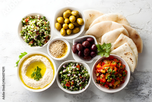 Mediterranean mezze platter with olives, tabbouleh, dips, and flatbread on white background