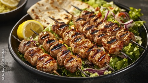 Mediterranean pork souvlaki skewers grilled and served with pita bread, fresh salad, and lemon wedges